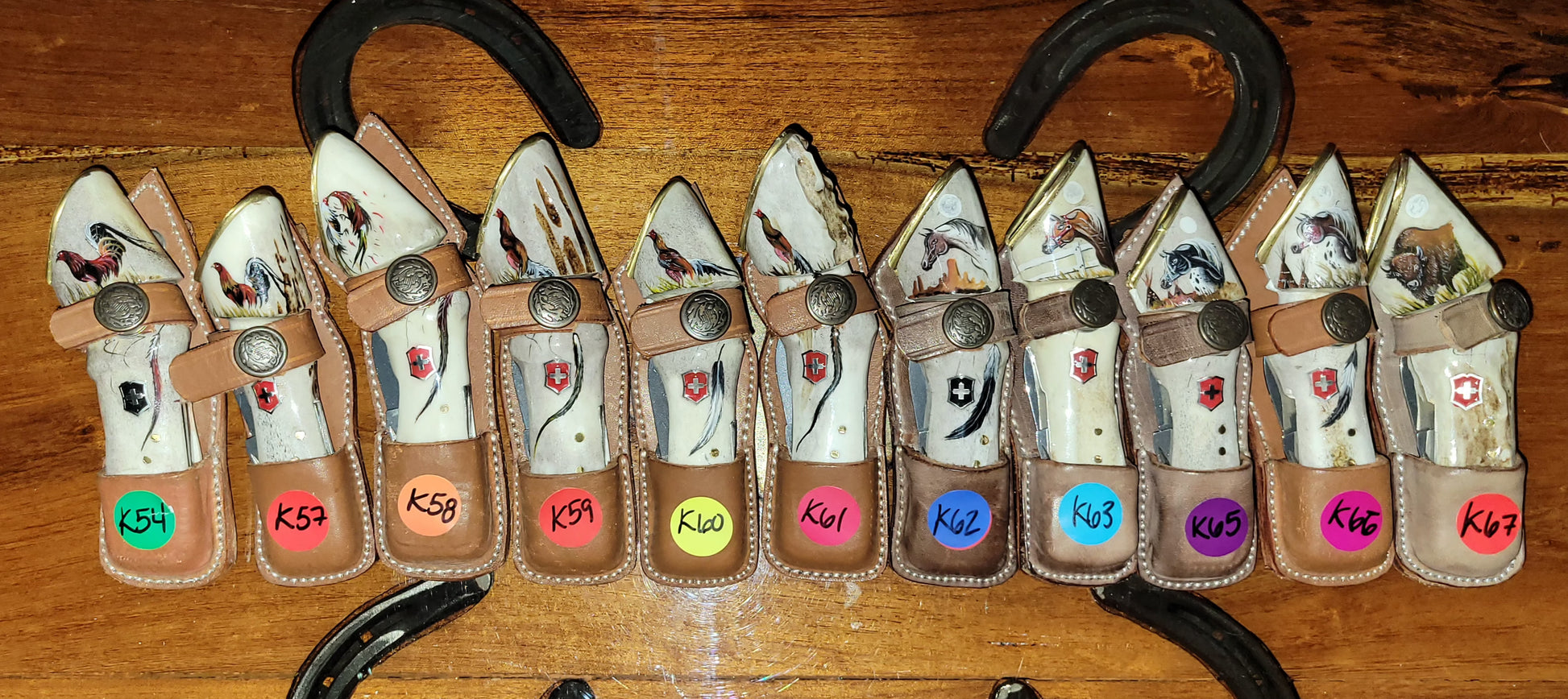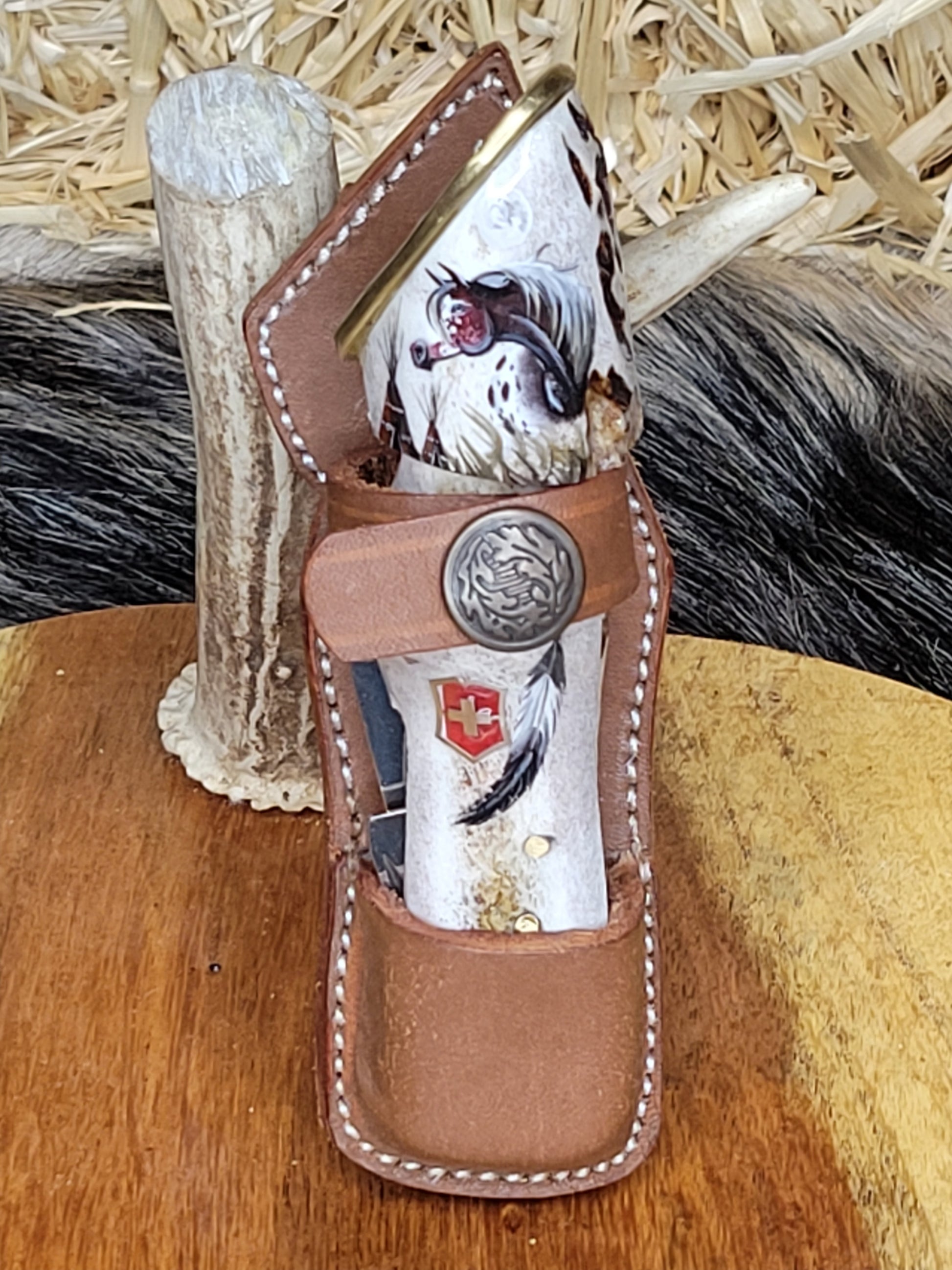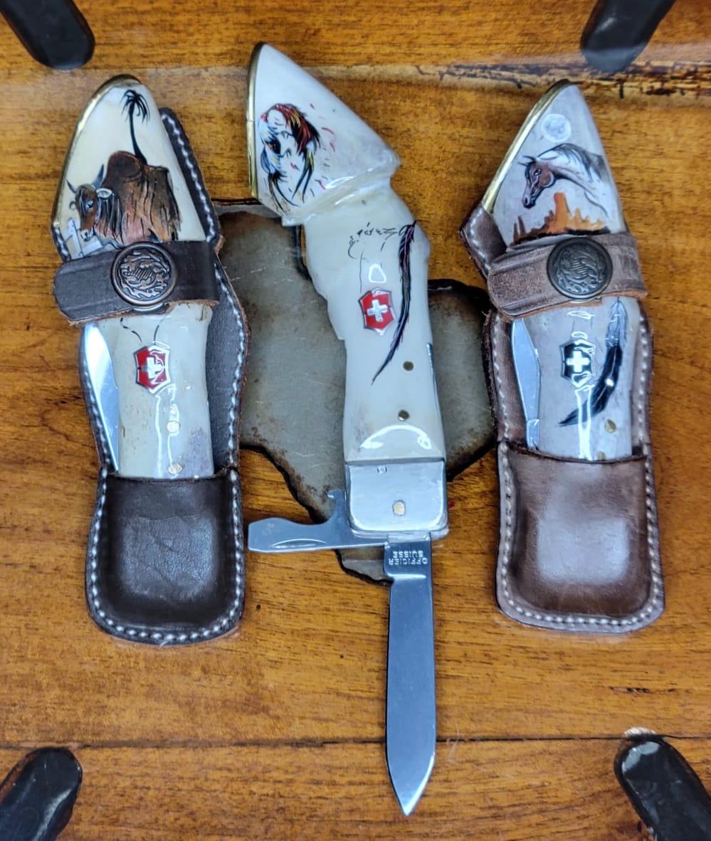 Navajaz suizas legitimas Victorinox en cabos de cuerno de venado, en forma de pata de caballo y heradura. El dibujo es pintado completamente a mano. Funda de piel. Trabajo 100% artesanal.