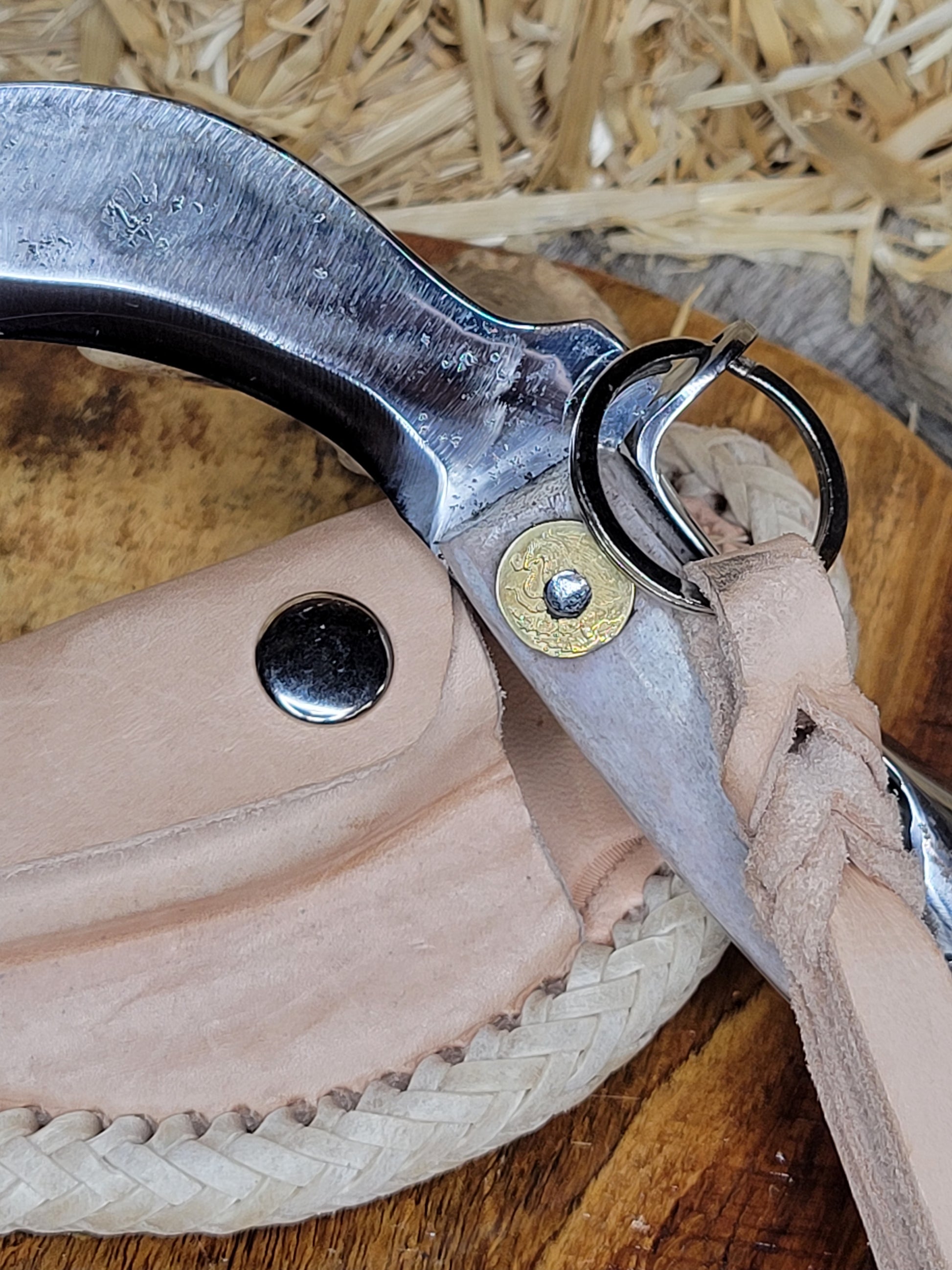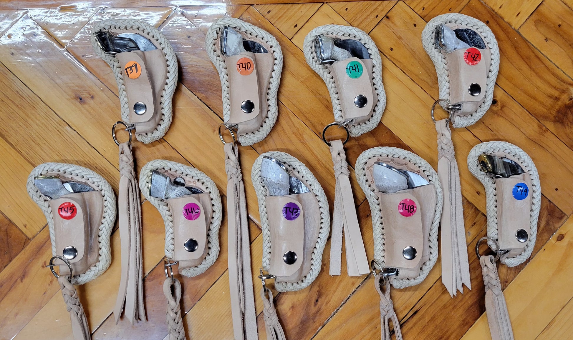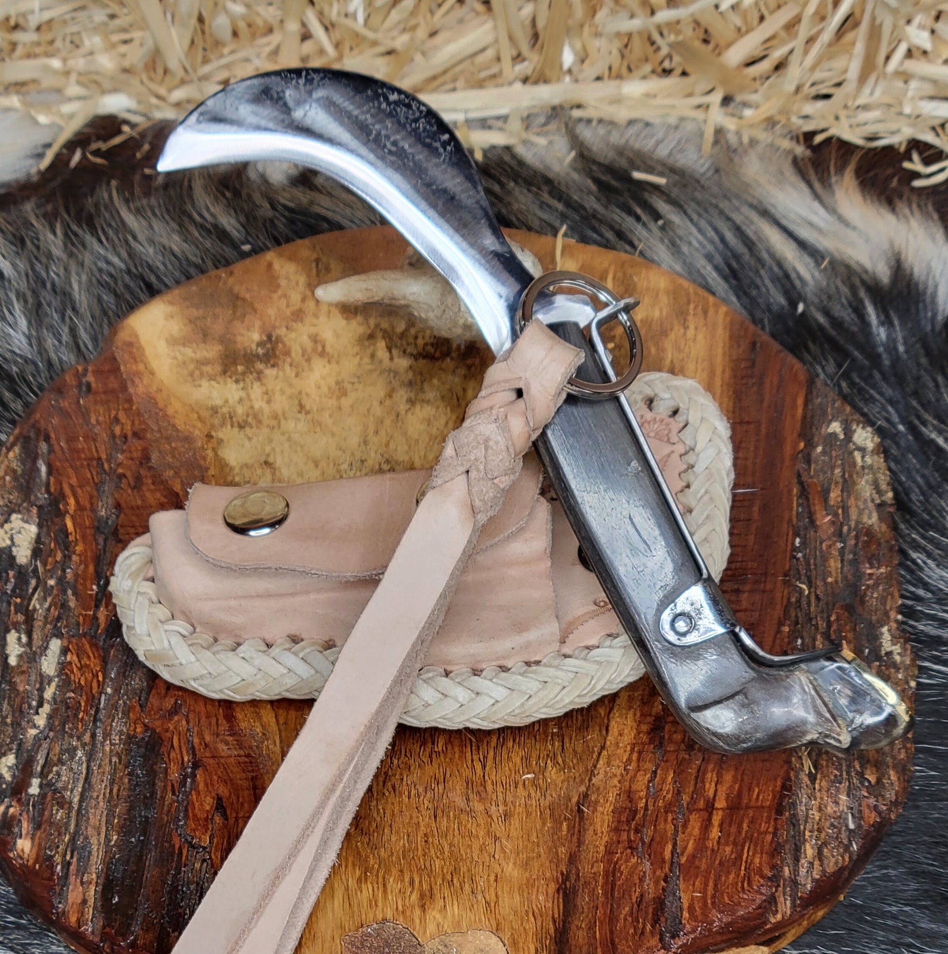 Tranchetes tradicionales con pata de caballo y herradura en cuerno de venado y cuerno de toro. Con sistema de bloqueo. Forjados en acero de alto carbono, hechos en fragua con tratamiento térmico y templado. En fundas de piel tejidas a mano trabajo 100% artesanal.