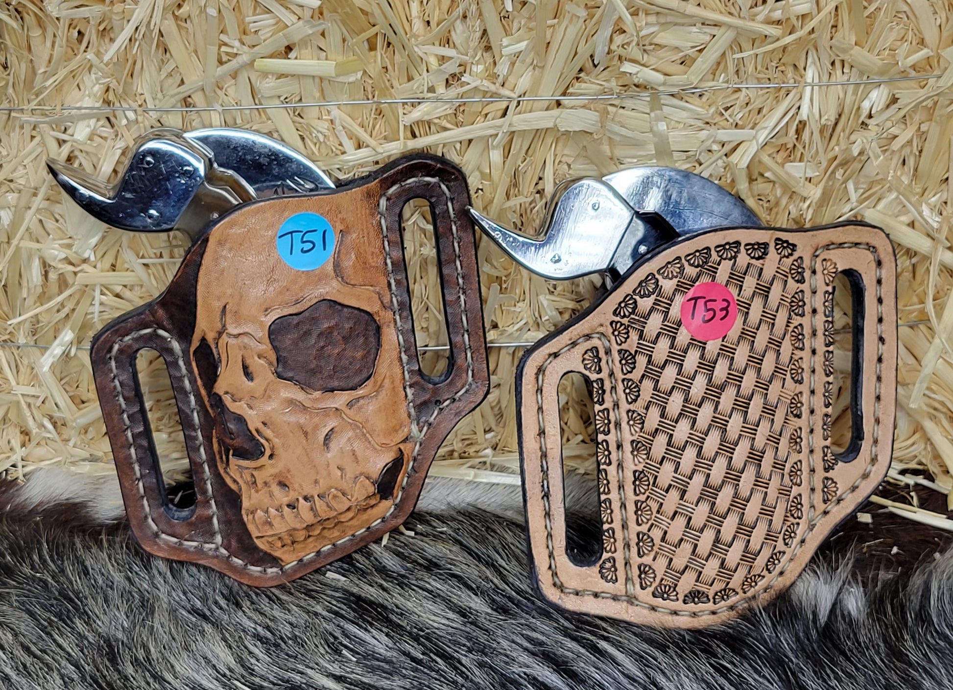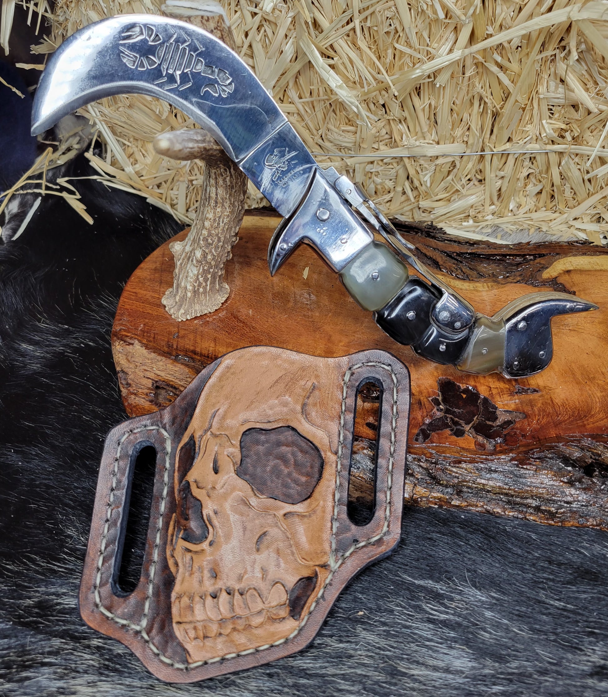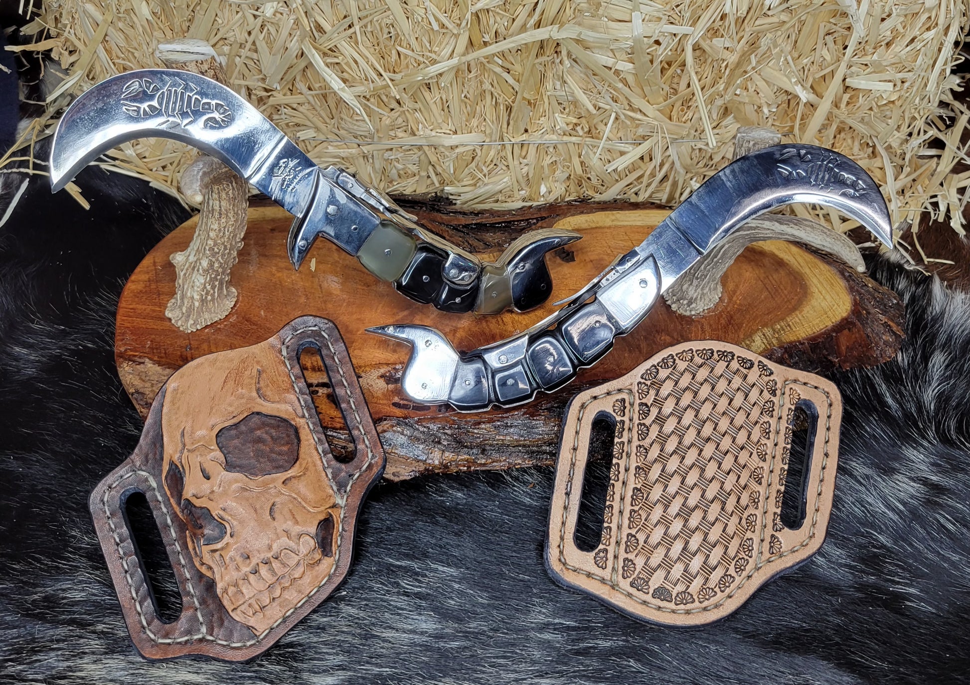 Tranchetes mecánicos, con sistema de bloqueo. Cachas de cuerno de toro forjados en acero de alto carbono echos en fragua con tratamiento térmico. Fundas de piel hechas y cinceladas a mano trabajo 100% artesanal