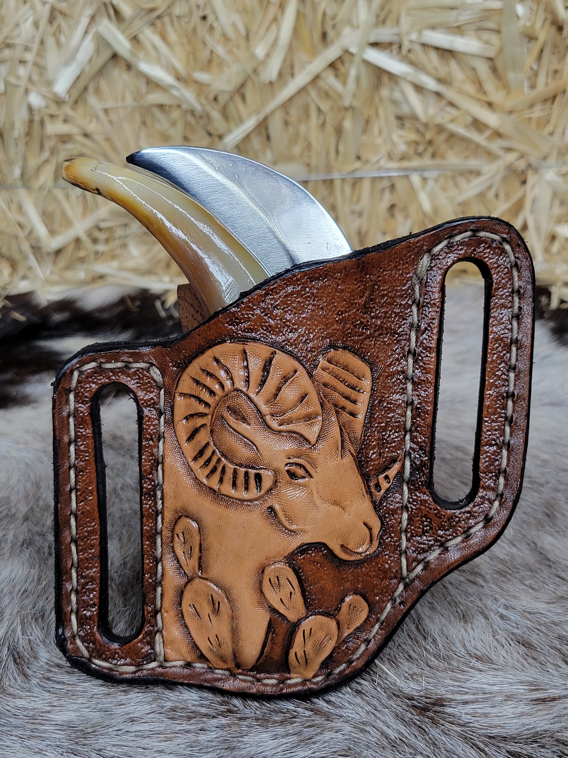 Tranchete forjado en acero inoxidable, hecho en fragua con tratamiento térmico y templado. En cabo de cuerno de toro y bronce. Funda de piel cincelada hecha a mano. Trabajo 100% artesanal.