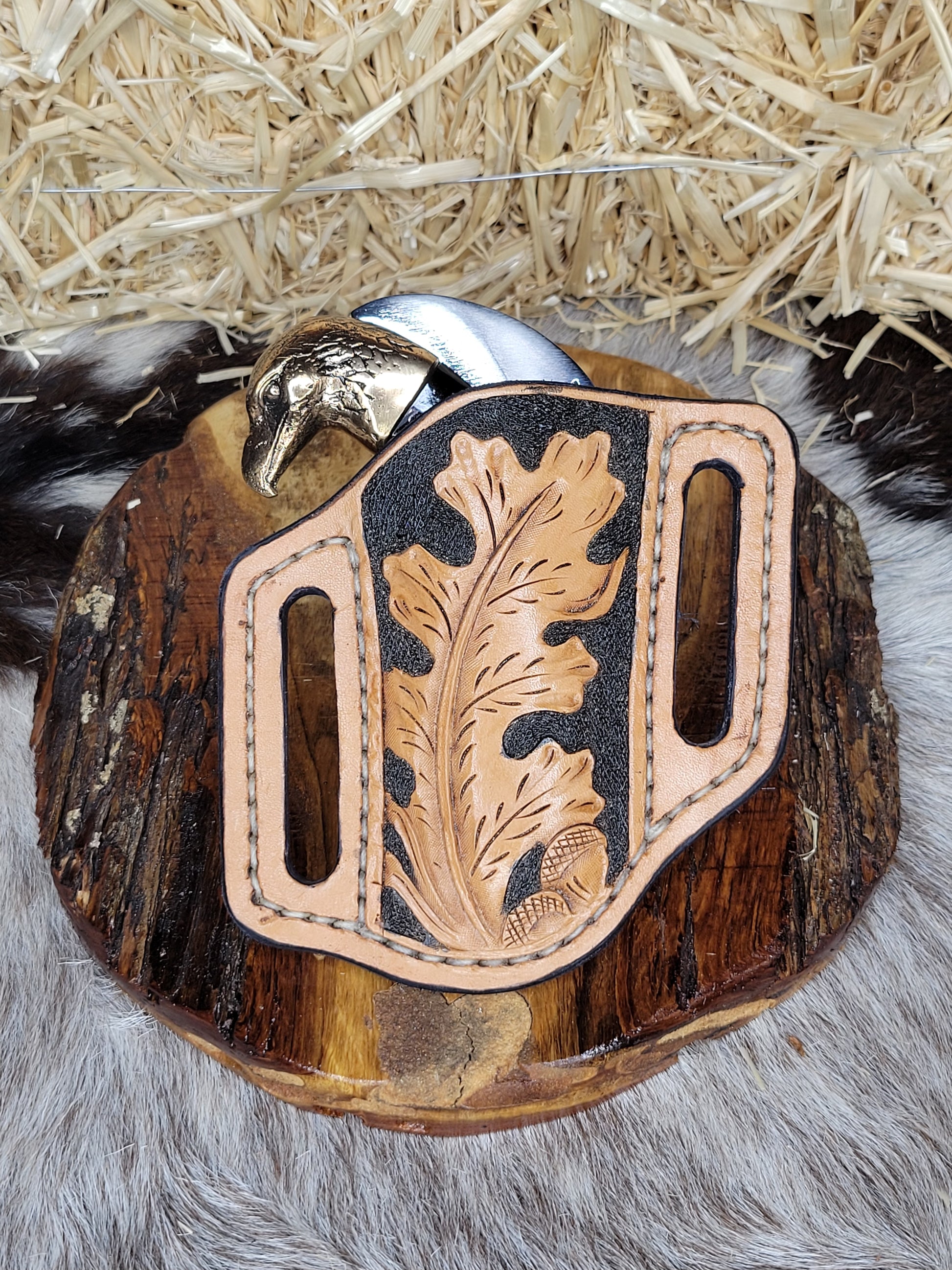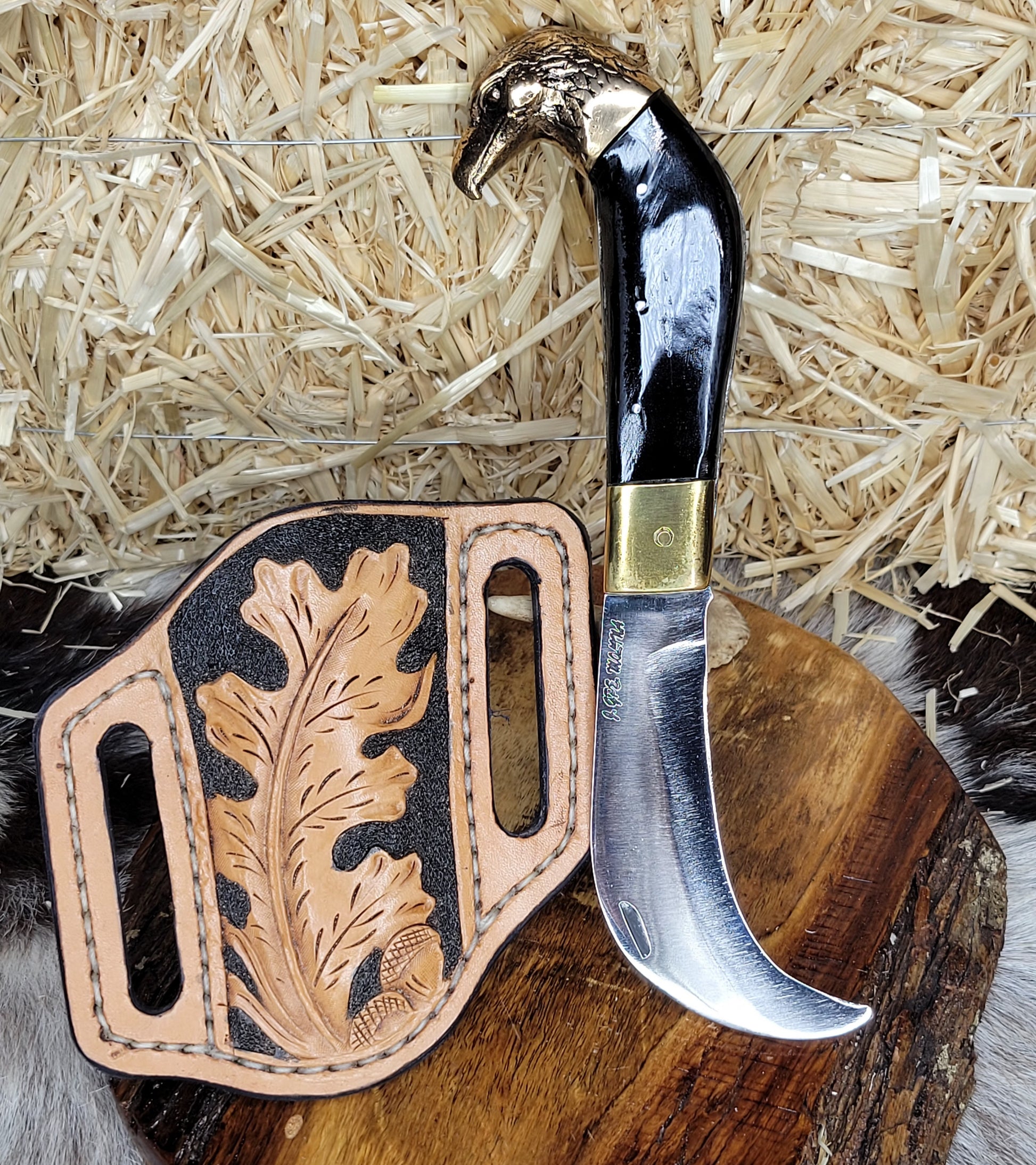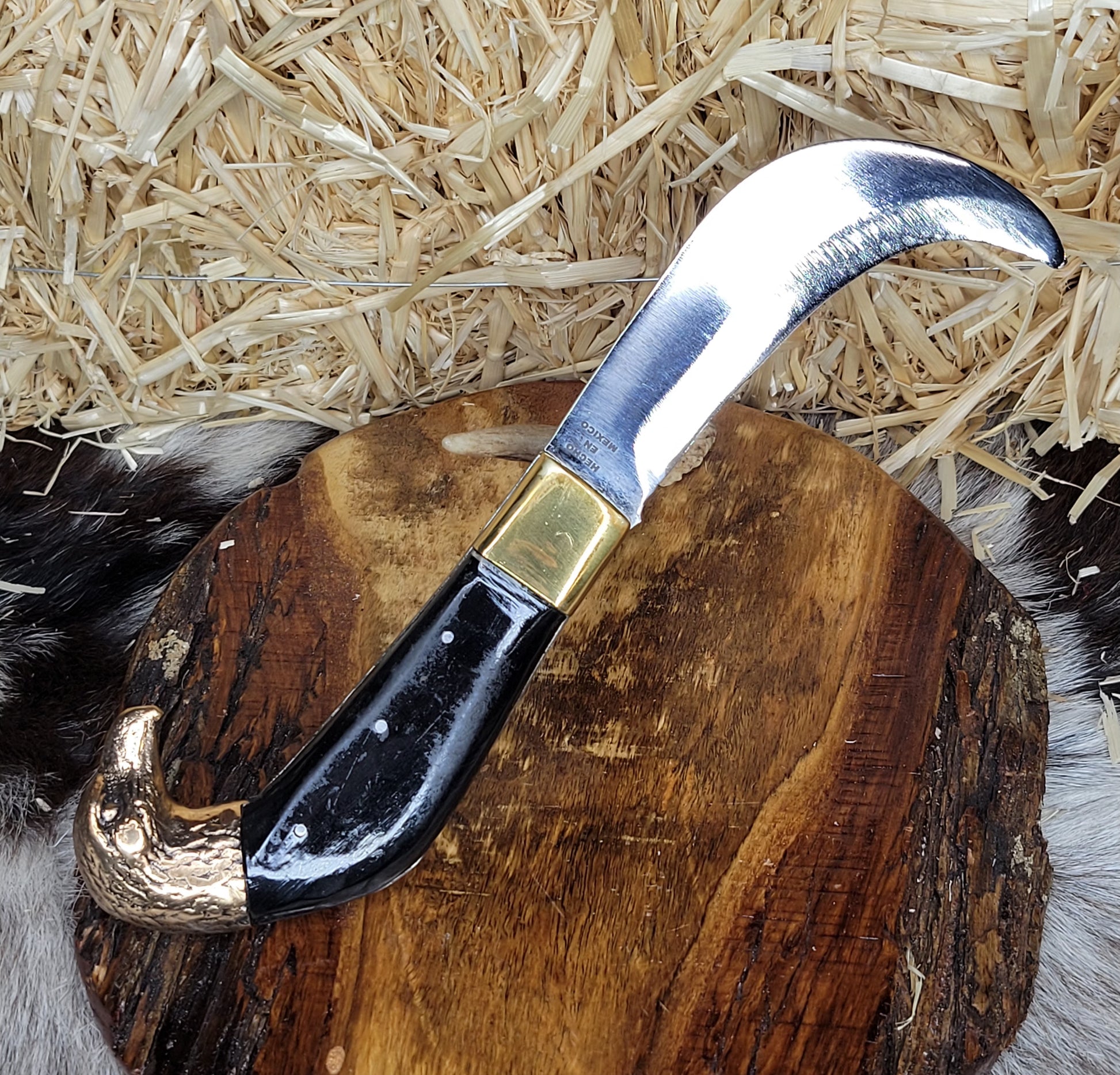 Tranchete forjado en acero inoxidable, hecho en fragua con tratamiento térmico y templado. Cachas de cuerno de toro y figura en bronce. Funda de piel hecha y cincelada a mano trabajo 100% artesanal