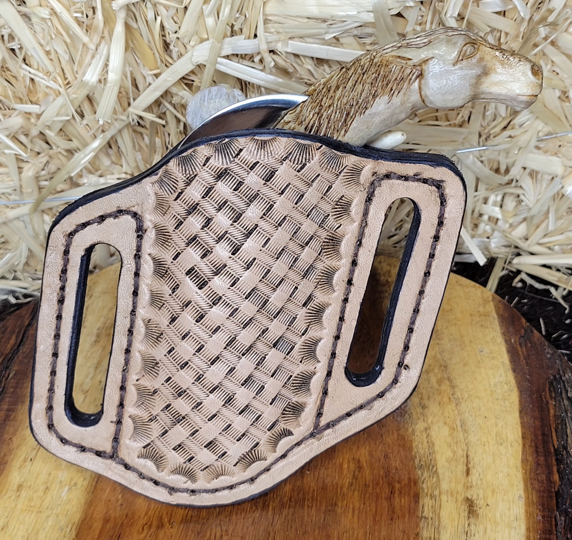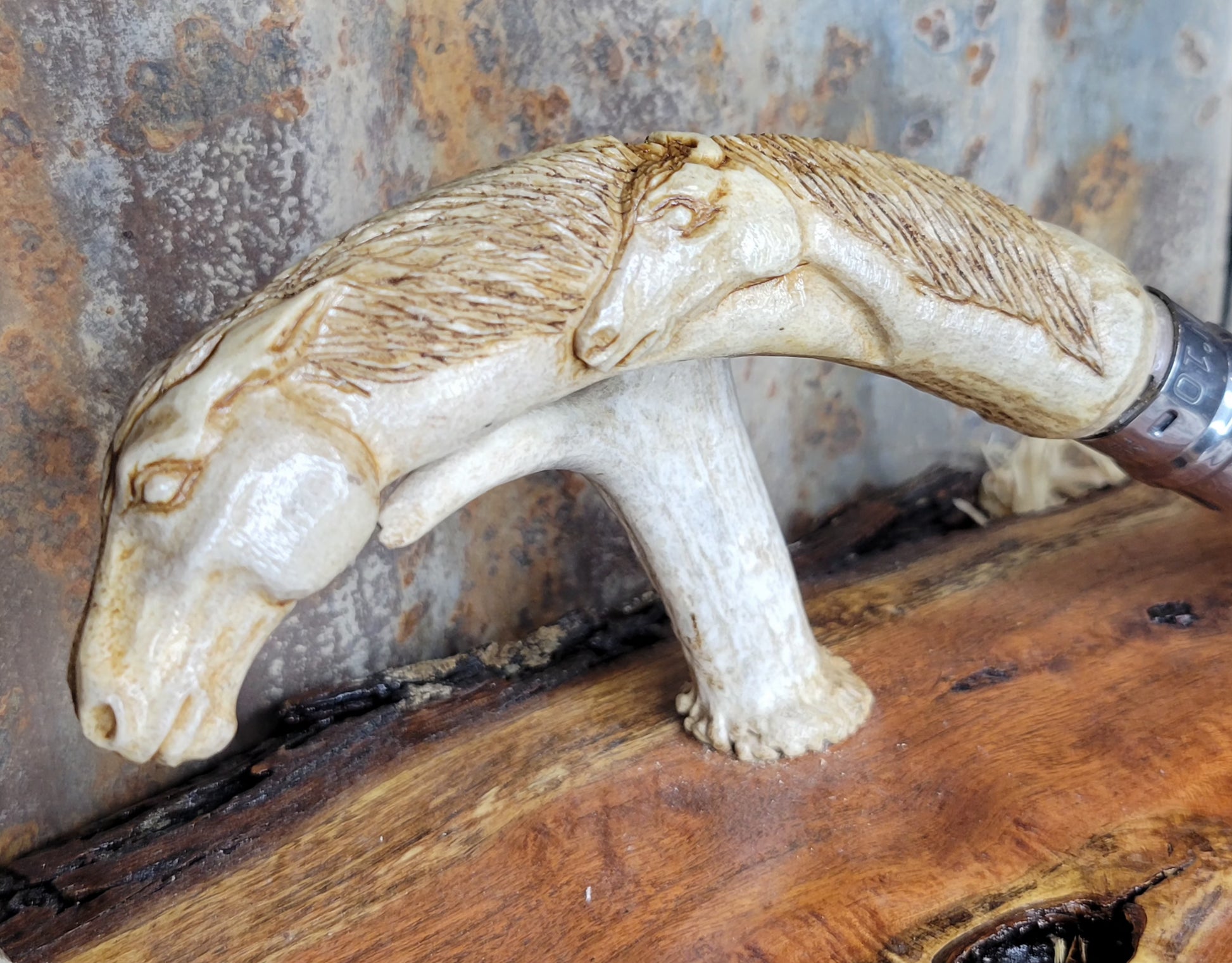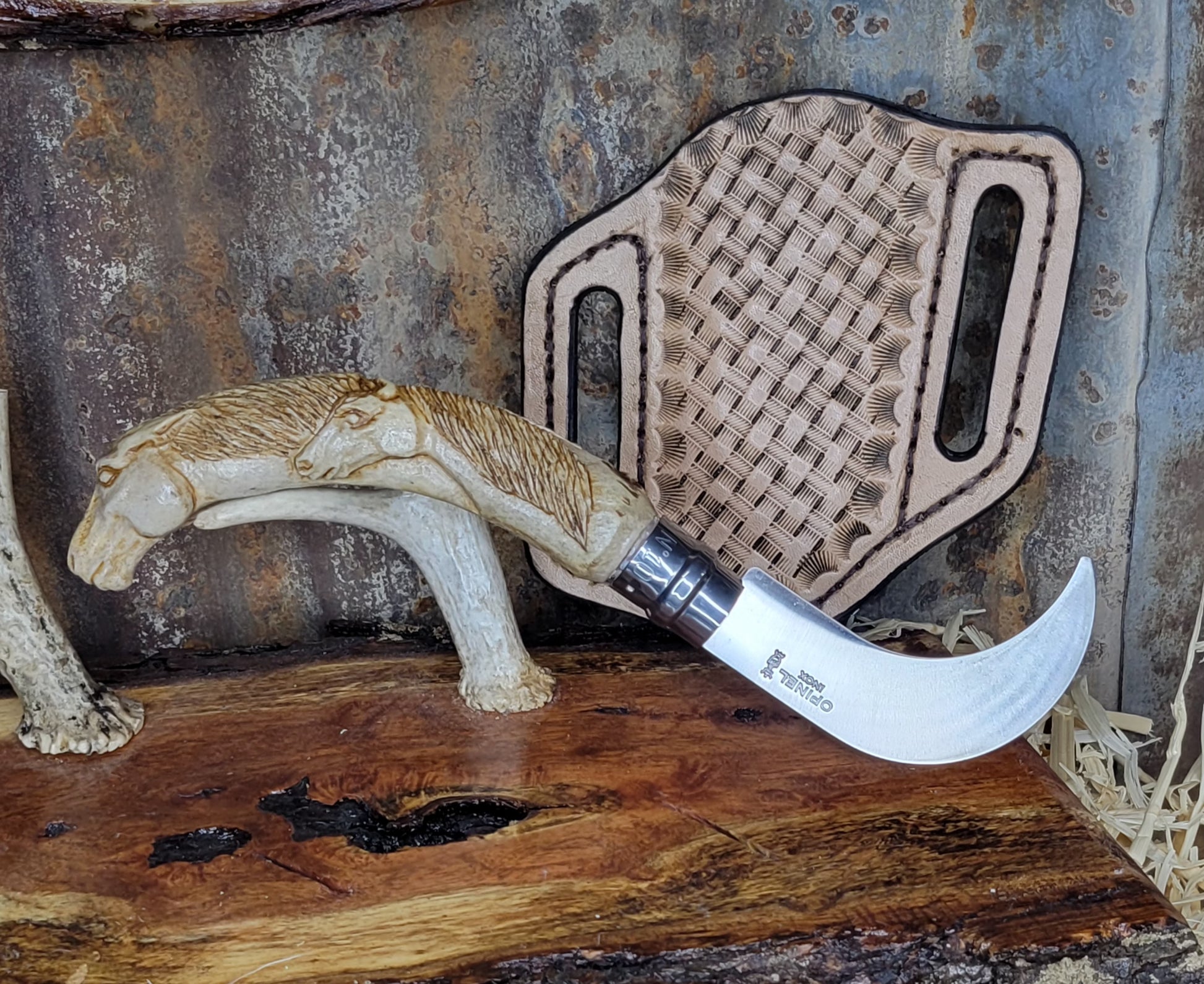 Tranchete dos caballos de la marca Opinel, en acero inoxidable. Cabo en cuerno de venado tallado a mano. Funda de piel cincelada hecha a mano. Trabajo 100% artesanal.