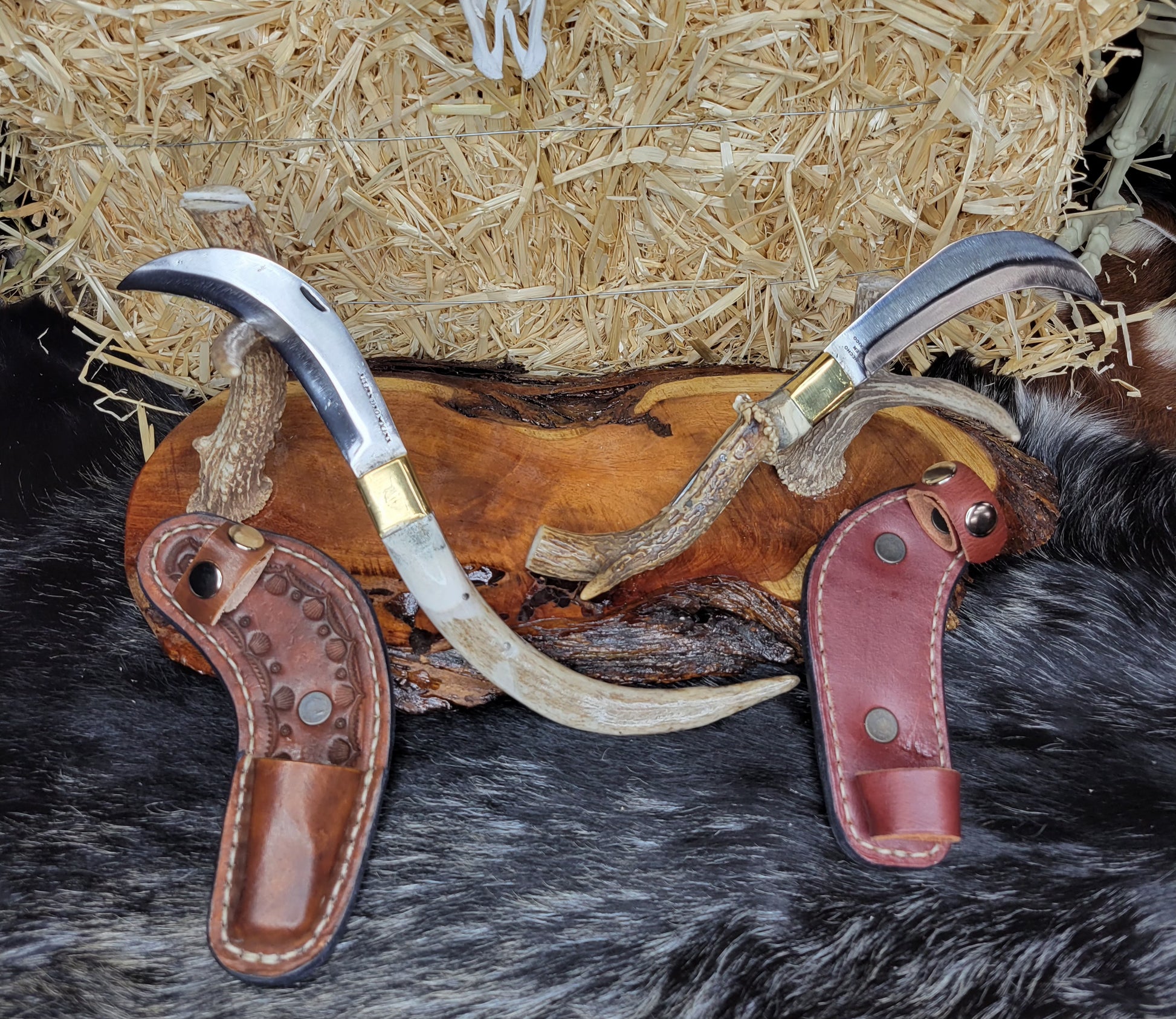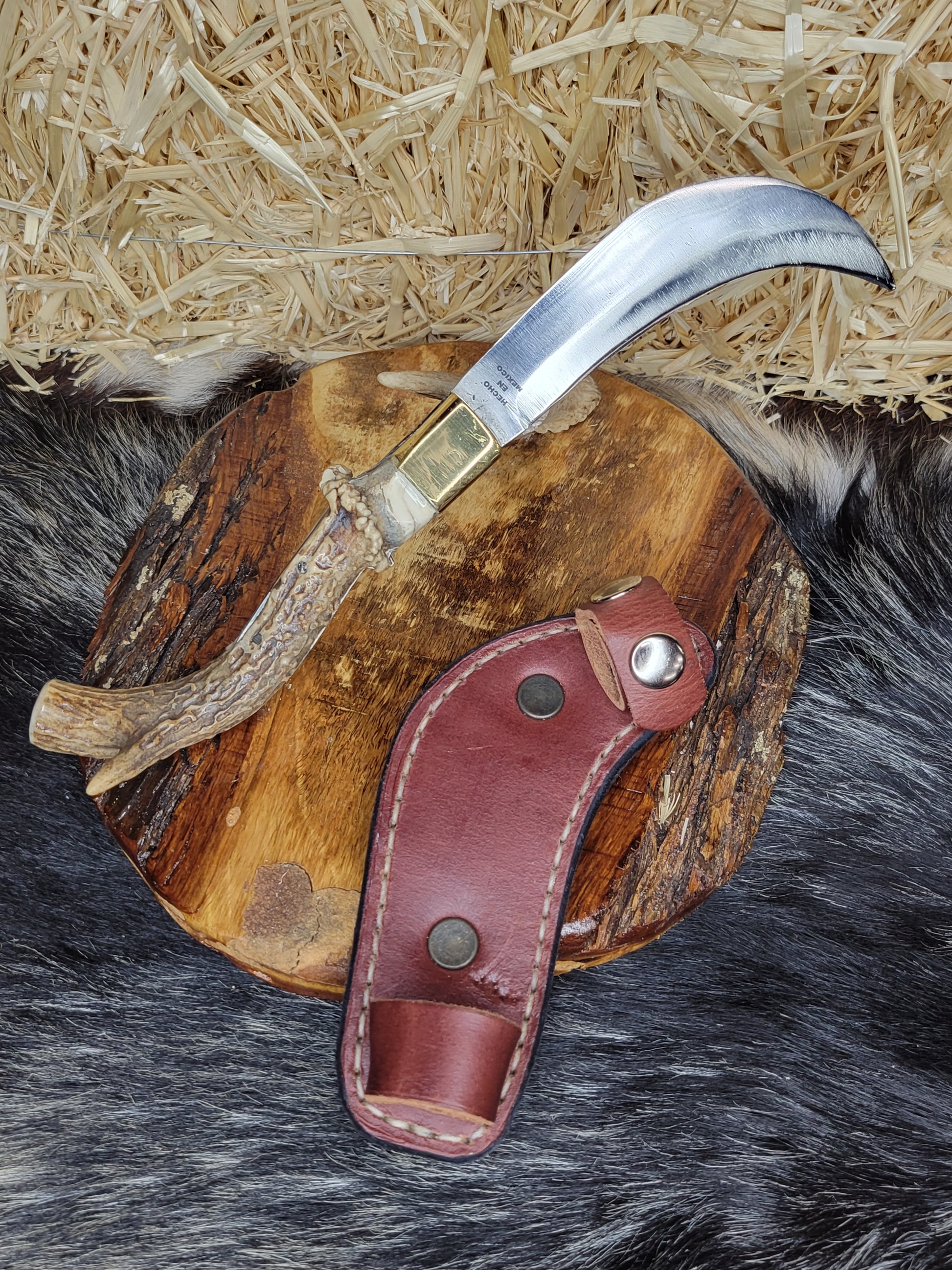 Tranchete forjado en acero inoxidable hecho en fragua con tratamiento térmico y templado. Cabo de cuerno de Venado. Fundas de piel hechas a mano. Trabajo 100% Artesanal.