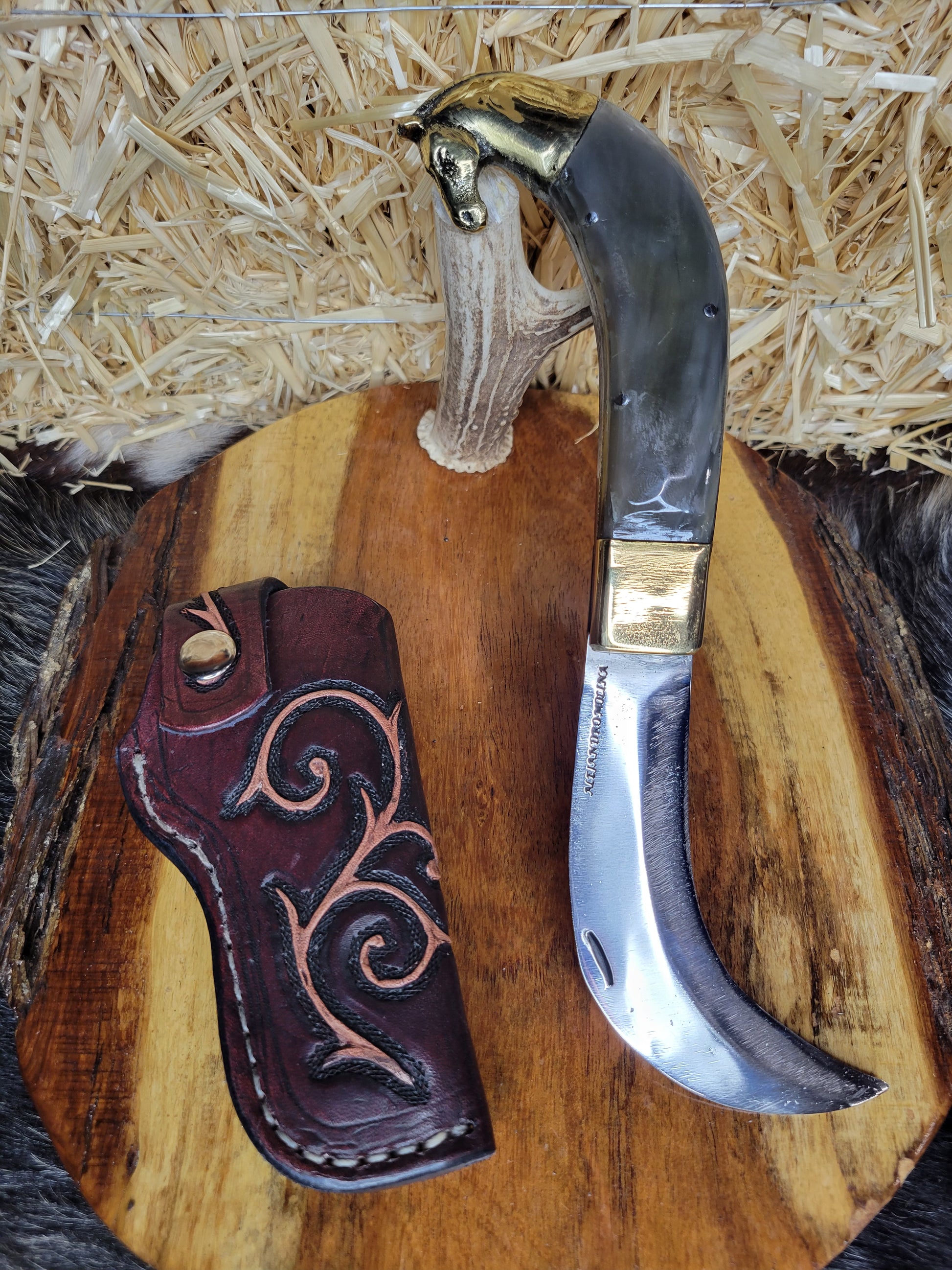 Forjado en acero inoxidable hecho en fragua con tratamiento térmico y templado. Cachas de cuerno de toro. Caballo en bronce. Fundas de piel hechas a mano. Trabajo 100% Artesanal.