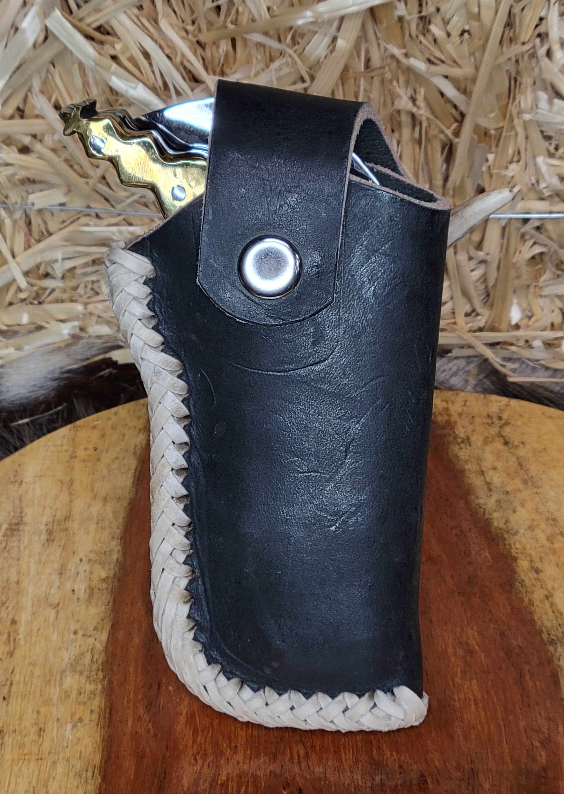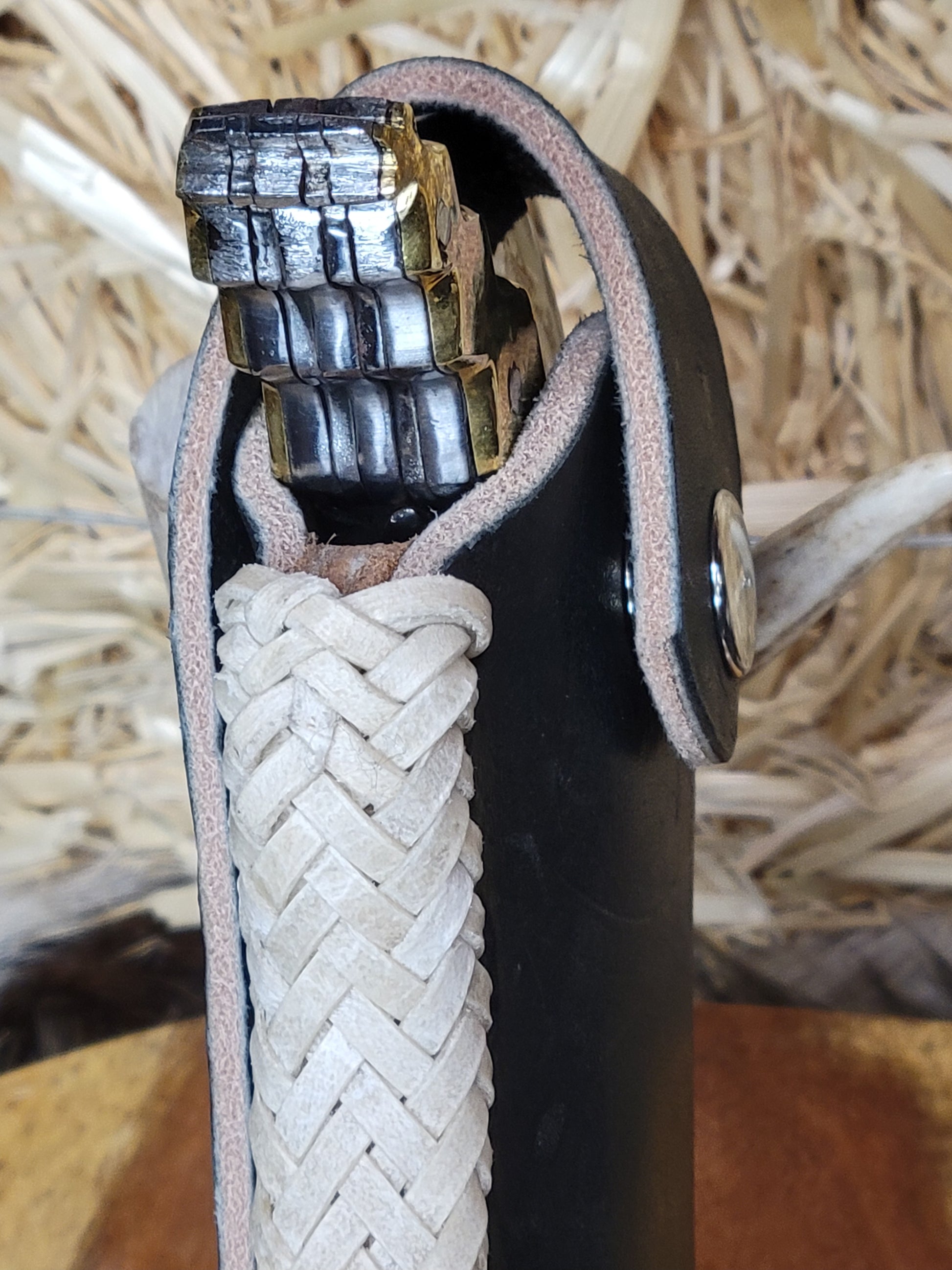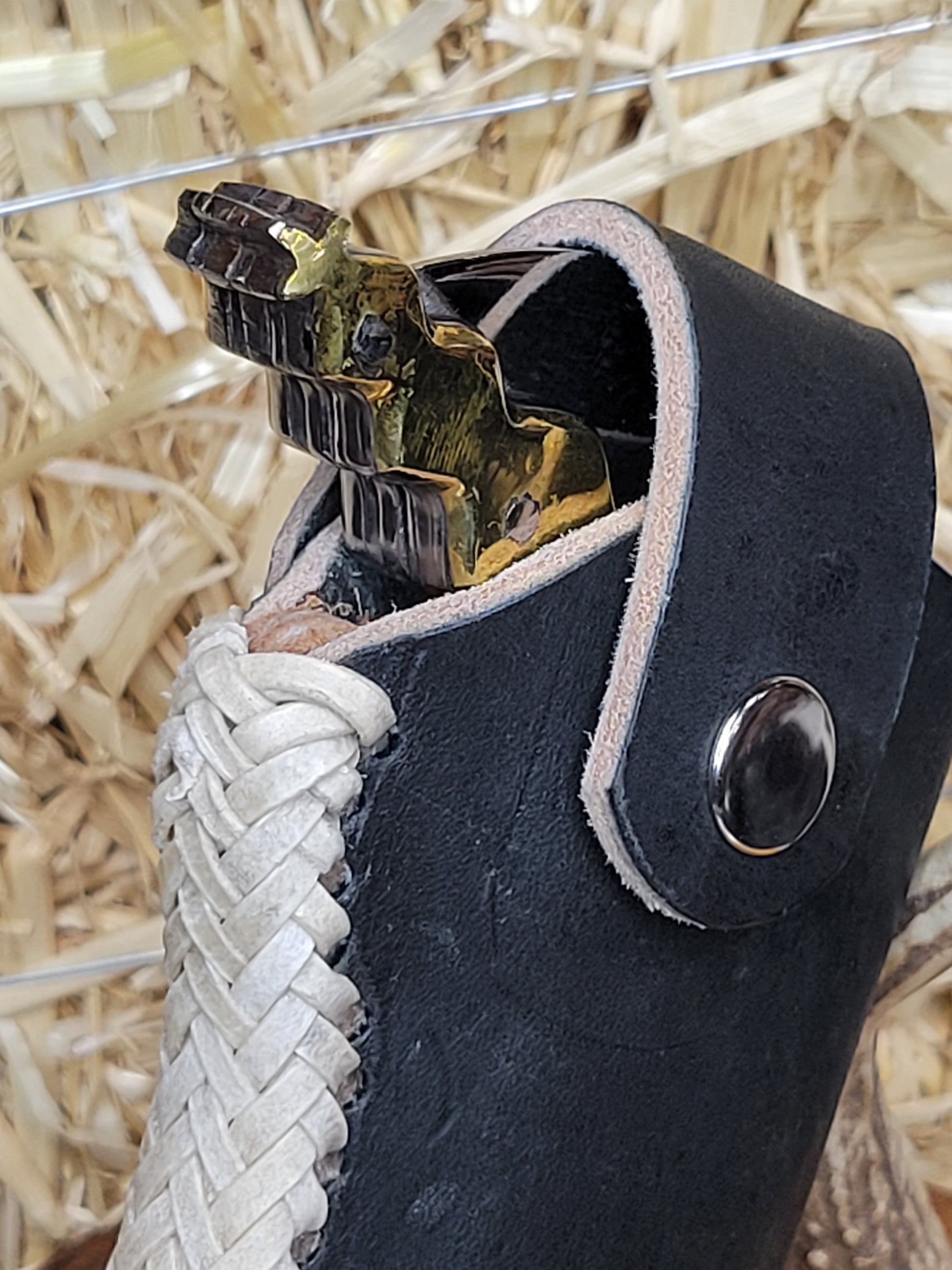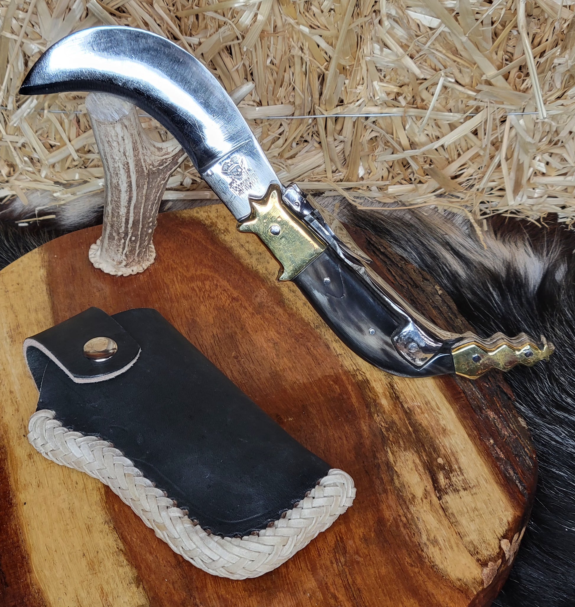 Tranchete mecánico con sistema de bloqueo y palanquilla de liberación. Forjado en acero de alto carbono hecho en fragua con tratamiento térmico y templado. En cachas de cuerno de toro torneado y decoraciones en bronce. Funda de piel tejida con piel cruda hecha a mano trabajo 100% artesanal.
