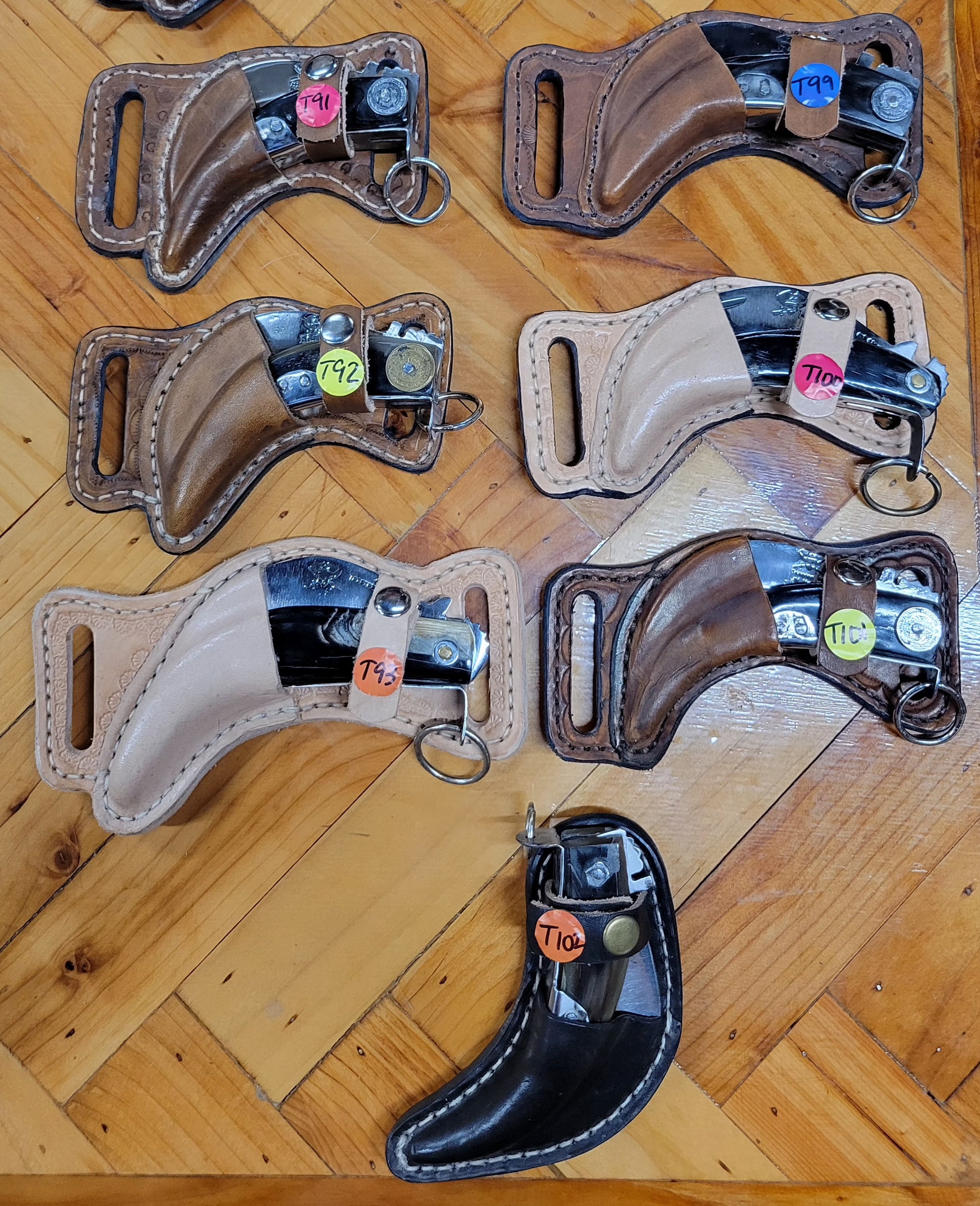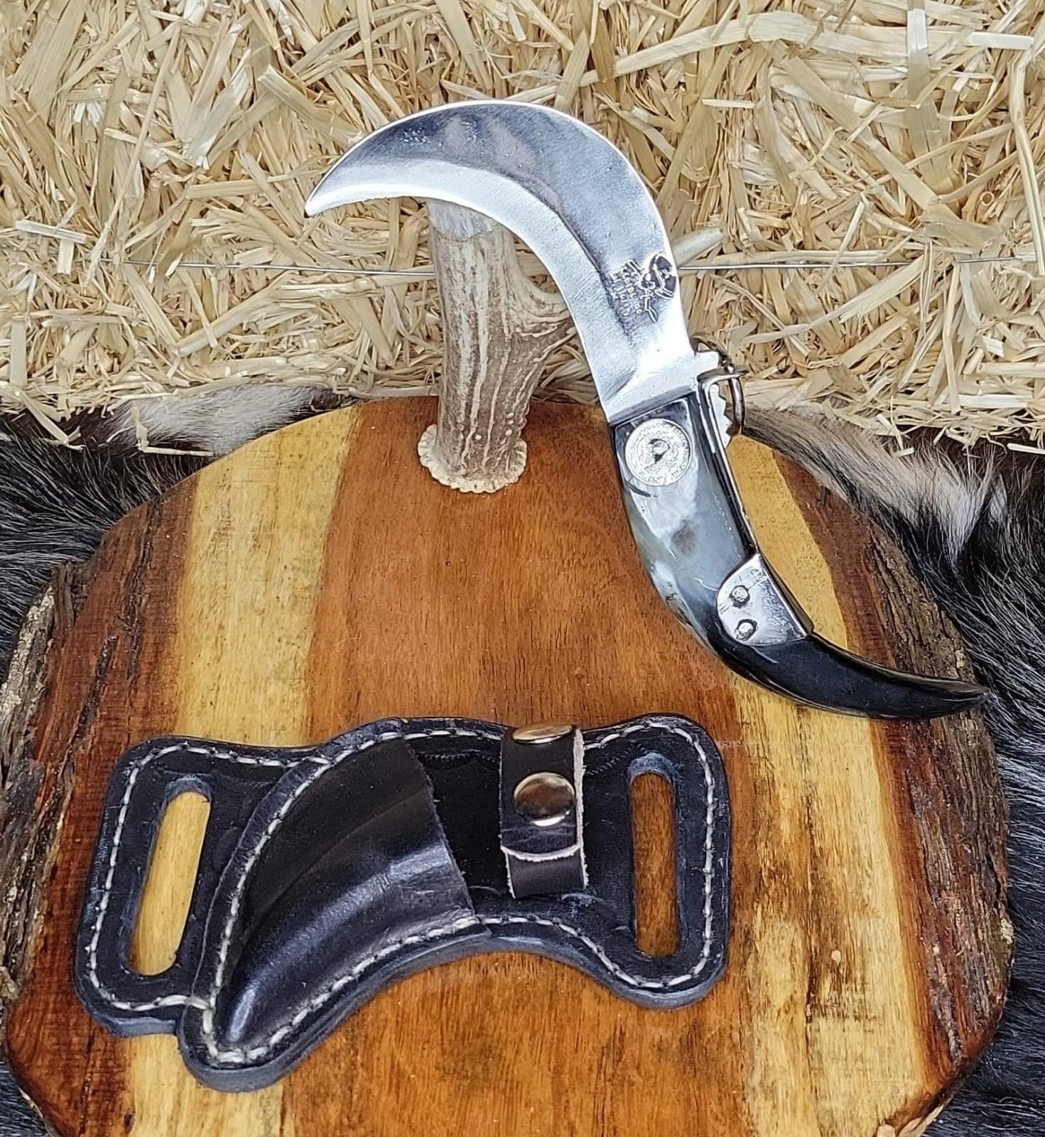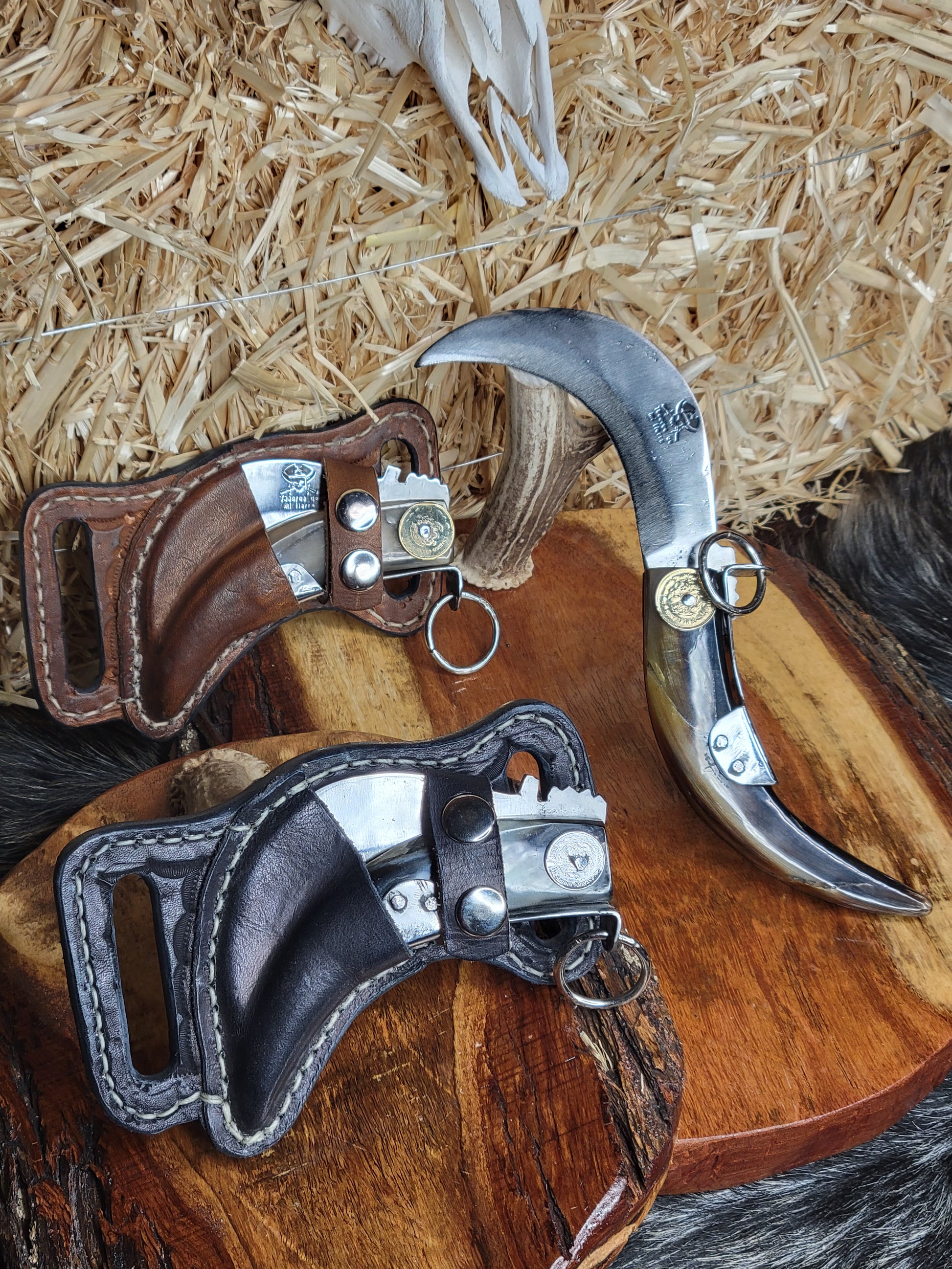 Tranchete tradicional de brincos. Forjado en acero inoxidable hecho en fragua con tratamiento térmico y templado. Cabo de cuerno de toro y decoraciones de monedas mexicanas. Fundas de piel hechas a mano. Trabajo 100%